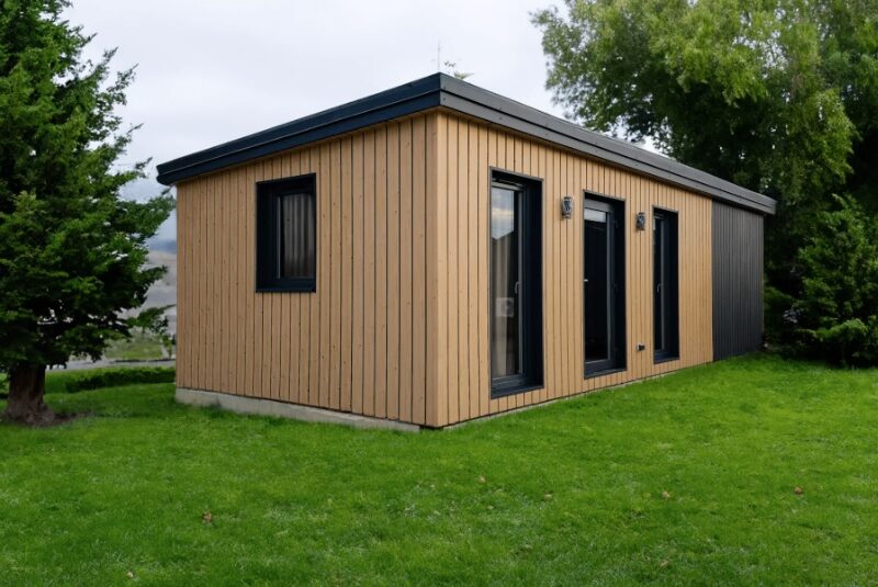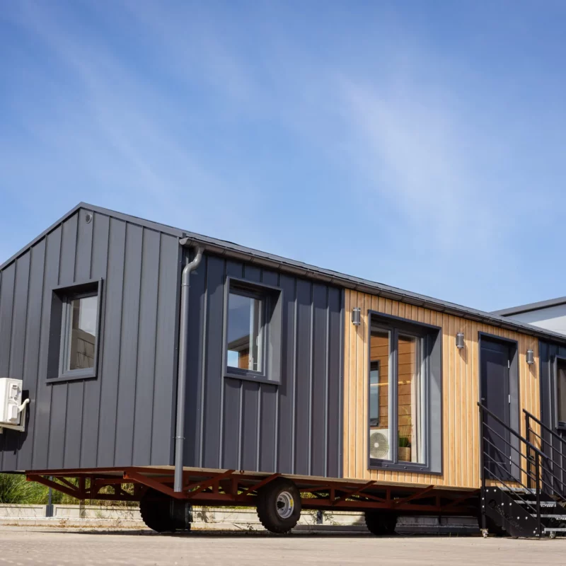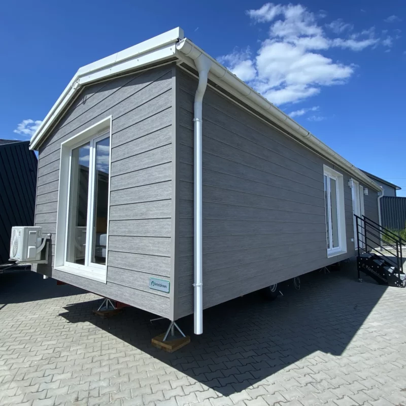 Mobilny domek letniskowy z dwiema sypialniami, dostępny w wersji „basic” lub z pełnym wyposażeniem.