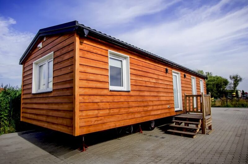 Mobilny domek letniskowy z trzema sypialniami i możliwością noclegu do 8 osób.