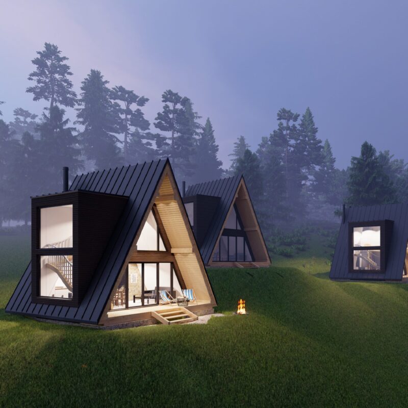 Nietuzinkowy całoroczny domek wyróżniający się dużymi okiennicami.